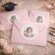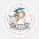 A cheerful kindergarten graduation design featuring a smiling child in a blue cap standing in front of a pastel pink school bus, surrounded by a circular border with celebratory text. Soft colors and playful artwork make it perfect for stickers and envelope seals celebrating this special milestone.