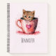 Spiral notebook with a cute little kitten. Sitting in a teacup looking positively adorable. One little paw hangs on the brim. Hearts swirl all around. Sweet and whimsical.