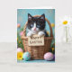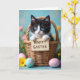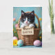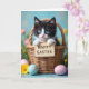 This greeting card features a small black-and-white kitten peeking out of a rustic woven basket, looking straight ahead with bright blue eyes that feel like an affectionate hello. Its tiny paws hold a little wooden sign near the center, with a short holiday greeting printed in dark lettering that stands out against the pale wood. Soft, hazy light falls across the scene like early spring, giving the kitten’s fur a gentle glow and making the basket texture feel cozy and close. In the foreground, several decorated eggs in pastel blue and pink sit together like they’ve been arranged by a caring friend, their floral motifs adding a tender, shared-celebration mood. Behind them, blurred greenery sets a calm backdrop, dotted with small yellow blooms and hints of purple flowers 🌷. The layout keeps the kitten and sign as the main focus, while the eggs and blossoms frame the lower portion and guide the eye upward. Fine details show in the kitten’s downy fur, the wicker weave, and the smooth shine on the eggs 🐰. The pastel eggs display painted flowers and delicate patterns in soft blue and rosy pink near the bottom edge.