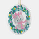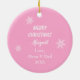 An adorable little gray and white kitten sits inside a teal Holiday string light wreath on the front of this ornament. The kitten wears a pink bow and winter scarf. The back of the ornament is solid matching pink, with scattered white snowflakes and your custom text in five fields. Easy to customize, and any little girl would love this keepsake ornament!