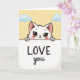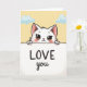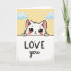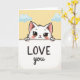 This card shows a sweet cartoon white kitten peeking over a white sign, with its tiny paws resting on the top edge. The kitten has big brown eyes with little lashes, and a soft pink blush on its cheeks that makes it look a bit shy and very lovable 🥰. Behind it is a light yellow sky with two small baby-blue clouds, giving the scene a calm, sunny feel. The bottom part of the card is mostly the sign, so your eye goes straight to the message. It reads “LOVE you,” with “LOVE” in dark, thick, simple letters and “you” in a smoother, flowing style right beside it. The mix of the kitten’s gentle expression and the straightforward message makes it feel easy to give to a partner, close friend, or anyone you care about ❤️. It’s the kind of card that says a lot without trying too hard, and it helps you share Valentine’s Day sentiments in a kind, honest way.