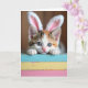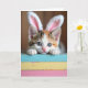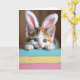 This greeting card features a close-up of a young kitten with a white, ginger, and warm brown coat, gazing forward with wide blue‑green eyes that seem to invite a quiet, affectionate bond. Soft bunny‑ear headwear sits on its head, with fluffy white edges and pale pink inner lining, adding a sweet Easter touch 🐰. The kitten’s tiny pink nose and fine whiskers are sharply detailed, while the background fades into a warm, softly blurred glow that feels like a gentle hug. Its front paws rest on the top edge of a weathered wooden ledge, as if it’s peeking up with shy curiosity like a friend leaning in to say hello. Across the lower portion, Easter greeting text can sit centered in a light pastel tone, standing out without overpowering the photo 🌷. The wood shows horizontal planks with distressed texture, painted in sunlit aqua, pale yellow, and blush pink. The bunny ears appear upright with white fluff framing the pink lining.