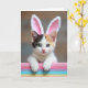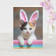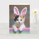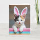 This card shows a small tri-color kitten centered on the front, looking straight out with big olive-green eyes that catch tiny light specks. Its coat mixes white, black, and warm orange patches, and it wears a fluffy headband with long bunny-ear shapes, bright pink on the inside and trimmed in white 🐰. The kitten’s front paws rest on a neat stack of horizontal wooden planks painted in soft pastel pink, lavender, pale blue, and buttery yellow. Gentle, diffused lighting smooths the scene with almost no harsh shadows, making the kitten’s gaze feel like a quiet invitation to come closer. A tiny pink nose and fine white whiskers add to the tender, friendly look, as if it’s posing for someone it trusts. The greeting text sits above the kitten in a light pastel tone, with a smaller line placed near the bottom edge in a matching color 🌷. Behind everything, the background stays softly blurred and neutral, while the pastel planks form a low, striped base beneath the kitten.