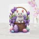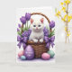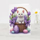 This card shows a fluffy white cat with bright blue eyes sitting calmly in a rustic woven basket, its small paws resting on the rim as if it’s waiting for a gentle hello. Purple tulips rise behind the basket and smaller purple blossoms spill around the sides, framing the cat like a bouquet offered in friendship 🌷. Two lavender satin bows are tied neatly on the front, adding a soft, romantic touch that matches the flowers. Pastel eggs in pale pink, mint green, and sky blue are scattered at the base, giving the scene a light Easter feel 🐇. A lavender egg placed front and center carries the message “To a Wonderful Kid!” in white lettering. The text sits on the egg’s front face, standing out clearly against the purple background. Soft, diffused lighting makes the cat’s fur look airy and highlights the matte finish on the eggs. The basket’s woven texture and the tulips’ deep purple petals are sharply defined behind the cat’s pink nose and ears.