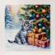 Fluffy gray kitten with sapphire eyes peeks from golden gifts beneath a glowing Christmas tree. Snowflakes dance around twinkling ornaments.