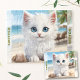 Cute jigsaw puzzle featuring an adorable white fluffy kitten on the beach. Makes a cute personalized stocking stuffer or birthday gift for kids and all the cat lovers. Comes with a cardboard carry-case with a puzzle image printed on the lid! Easily personalize the text or leave it blank. - Kate Eden Art