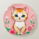 Bright and cheerful illustration featuring an adorable kitten surrounded by colorful pink and yellow flowers.