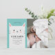 Cute birth announcement card for your newborn baby. The card has an illustration of a white cat with a cute smile. On his belly is the baby's name and birth stats. Add your baby's photo next to the illustration. 2nd photo can be added on the back of this two sided card. Text and photo are easily editable online.