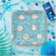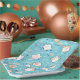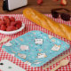 Paper plates with a cute cat pattern, set on a blue background and decorated with rainbows and paw prints and more.
