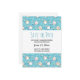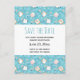 Save the date postcard with a cute cat pattern, set on a blue background and decorated with rainbows and paw prints and more.