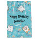 Happy Birthday gift bag with a cute cat pattern, set on a blue background and decorated with rainbows and paw prints and more.