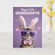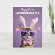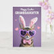 This card shows a striped tabby cat centered on a smooth lavender background, dressed up with plush white bunny ears lined in soft pink 🐰. Heart-shaped lilac glasses sit over its eyes, giving it a gentle, curious look that feels like it’s waiting for a sweet friend to smile back. A pastel pink bow tie rests neatly at the neck, adding a tidy, affectionate touch against the warm brown and cream fur. Soft, diffused lighting brings out the fine whiskers and the subtle patterning in the coat, keeping the scene calm and cozy. Small pale-pink hearts are sprinkled around the background, like little hints of closeness floating in the air 🌷. Near the top, a celebratory message appears in large white lettering, centered and easy to read against the purple field. The bunny ears are tall and rounded, with the pink inner details clearly visible above the cat’s head.
