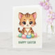 Designed with a sweet, stylized kitten as the main character, shown in caramel and cream tones with gentle tabby stripes. Its large shining eyes catch the light, and the softly blushed cheeks and tiny rosy nose give it a tender, friendly look, as if it’s gazing at someone it trusts. Around the kitten’s paws sit smooth oval eggs in mint green, baby pink, and sky blue, adding a seasonal touch 🌷. The background stays pale with a faint texture, letting the warm fur colors stand out without distraction. Near the bottom, a short Easter greeting appears in solid green lettering, centered and easy to read 🐰. The lines are soft and flowing, and the eggs have small highlights that make them look slightly glossy. A light glow surrounds the kitten, with the green text resting just below the cluster of pastel eggs.