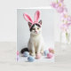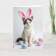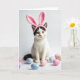 This card features a white cat centered on a bright white background, wearing a pink headband with tall bunny ears 🐰. A black patch over the top of its head and a few dark markings add contrast, while its golden eyes look straight ahead with a gentle, inviting focus, like it’s waiting for a friend to lean in closer. Soft lighting smooths the fur and gives the scene a cozy, affectionate mood without needing extra scenery. Along the lower foreground, several egg-shaped decorations are scattered in pastel blue, blush pink, pale lavender, and creamy white, adding a spring touch 🌷. The cat’s small pink nose echoes the pink ears, tying the colors together in a sweet, companionable way. The greeting text sits near the top in light pink, with a shorter line beneath it in soft gray, leaving plenty of open space around the cat. The eggs form a loose curve across the bottom edge, leading the eye back up to the cat’s face and bunny ears.