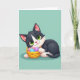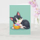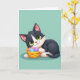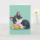 This card features a sweet cat centered on a smooth aqua background, drawn with charcoal-gray and white fur and big emerald-green eyes that seem to linger on you with a friendly, affectionate look 🌷. A tiny pink nose and soft rosy cheeks add warmth to its face, and the head is tilted as if sharing a quiet, inside moment. The cat reclines comfortably while holding a small woven basket in golden yellow, tucked close like a treasured gift. Inside the basket sit several egg-shaped decorations in pastel blue, pink, and lavender, each marked with delicate white patterns that hint at a springtime celebration 🐰. The lighting is gentle and diffused, rounding the cat’s features and bringing out the basket’s texture with subtle highlights. Near the top, a short Easter greeting appears in white lettering, centered and easy to spot against the aqua field. The patterned eggs show tiny white flowers and curls, and the basket’s weave is drawn with fine lines that wrap around its rim.