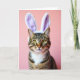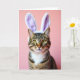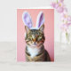 Designed with a close-up portrait feel, this card features the face of a domestic cat filling most of the space, drawing you in like a friendly glance across the room. A pair of plush bunny ears 🐰 sits on its head, trimmed with soft white fluff and shaded with a light lavender inner lining that adds a sweet, affectionate touch. The cat’s striped fur blends warm browns, deep charcoal, and creamy ochre, with fine detail that makes the coat look soft and real. Its almond-shaped eyes shine a golden-green, giving the expression a gentle curiosity that reads like quiet companionship. Delicate white whiskers spread from the muzzle, framing the face in a way that feels tender and inviting. Behind the cat is a smooth coral-pink background that keeps the focus on the animal and the pastel headwear 🌷. There is no text on the front, just the cat’s centered face against the soft coral field with lavender-and-white ears at the top.