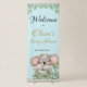 An adorable Mama Koala snuggles her baby against a background of baby blue footprints. The cute animals are a brownish gray with pink cheeks and ears, and fanciful black lashes and noses. Hand-painted foliage trims the top and bottom corner. "Welcome to" and your party's location (if needed) are in a black script font, while your event name is in gold in the same font.