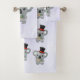 Towel set with an illustration of a cute gray koala eating some eucalyptus leaves, wearing a fancy black top hat with a red ribbon. Set on a light purple digital watercolor background.