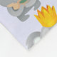 A blanket with an illustration of a cute gray koala eating some eucalyptus leaves, wearing a fancy golden crown. Set on a light purple digital watercolor background.