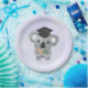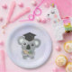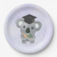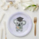 Paper plates with an illustration of a cute gray koala eating some eucalyptus leaves, wearing a black graduation cap. Set on a light purple digital watercolor background.