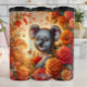This beautiful illustration features a cute koala with an innocent expression, framed by a vibrant arch of roses and other flowers in shades of pink and orange. The background is a soft sunset, and a few butterflies are visible. The scene has a romantic and charming feel, celebrating nature and cuteness.