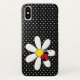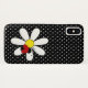 This adorable iPhone X case features a cute and trendy red and black ladybug on a white daisy design on a black and white polka dot background.