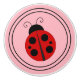 A red and black ladybug graces a pink background. Two black circles surround the ladybug