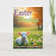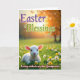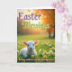 This card shows a young lamb resting in thick green grass, its soft white coat glowing gently against the field of tiny white and yellow flowers 🌷. The lamb’s dark, wide eyes and slightly pink ears face forward with a trusting look, like it’s quietly sharing a sweet moment with whoever is holding the card. Warm light pours in from the upper right, giving the scene a golden edge and turning the distant trees into a soft, blurry backdrop. The background stays out of focus so the lamb feels close and comforting, as if it’s leaning into a calm spring day. Across the top, the words “Easter Blessings” sit in purple and green lettering with a thin white outline, standing out clearly against the bright sky tones. Along the bottom, “Loving wishes to my dear Grandparents” appears in red lettering, placed low and centered like a gentle note of affection 🐇. Small white blossoms and sunny yellow blooms scatter around the lamb’s front legs, with the brightest glow catching the grass tips on the right side.