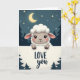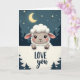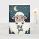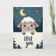At the center of the card is a cute cartoon sheep peeking over a creamy white banner, with a fluffy white head, rosy cheeks, and big dark eyes that look sweet and a little shy 🥰. Its small paws rest on the top edge of the banner, like it’s holding the message up for you to read. Behind the sheep is a deep teal night sky dotted with small glowing five-point stars. A golden crescent moon sits near the top, adding a calm, gentle glow to the scene. Dark pine trees in silhouette frame the background and make it feel like a quiet forest at night. On the banner, the text reads “LOVE you,” with “LOVE” in dark, thick uppercase letters and “you” in a darker, flowing cursive style, centered on the sign. It feels meaningful because the sheep’s soft expression and the peaceful night setting make the message come across as caring and sincere ❤️.
