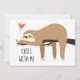Cute, funny card with cartoon sloth bear, expressing love. "Chill with Me" quote can be modified, personalized according to liking. Appropriate for Valentines Day, or just to show affection without occasion.