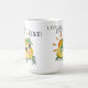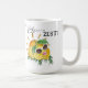 Colorful lemon zest mug features a watercolor lemon design where a lemon wears cool sunglasses, has lips and enjoys the sunshine. A great lemon quote reads: "Live life with zest!"