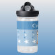 This water bottle features a cute leopard with stars in the colors blue and white.