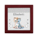 This product is made with beautiful mahogany wood, the inside is lined with white satin. The hinges are very sturdy and keeps a tight close on the box. The pattern tile is wonderful It's truly is an exquisite product. This is a gift for anyone and for any occasion. A fine wooden piece to display on your furniture anywhere in your home. The printing accented the design on the box very well. Very pleased with the Font.