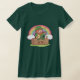 A cute doodle of a leprechaun seated on a wooden log and playing on the banjo with a rainbow and clouds in the background. Adorable and colorful design for St. Patrick's Day!