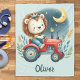 Adorable personalized fleece blanket featuring a cute lion driving a charming red tractor at night with a view of the moon.