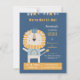 Funny play-on-words "We're Not Li-on!" party invitation in a smaller size than 5x7 for a little boy's one-year-old birthday featuring a proud lion with a blue crown wearing a rainbow shirt in shades of orange-gold and blues with text in matching colors on a dark blue background. The reverse side is a lovely gold-orange Fill in your own information in the template fields provided.