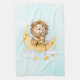 Kitchen towel with a cute watercolor illustration. An adorable lion wearing a crown fishing for stars sitting on a crescent moon resting on a fluffy cloud. Magical fantasy illustration. Light blue watercolor background.