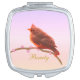 Cute red little bird compact mirror. The little bird is standing on a blooming tree branch on Ipanema color background. Beauty text can be customized.