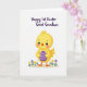 This design shows a small, bright yellow baby bird centered on a white background, drawn with soft shading that makes it look round and cuddly. Its large dark eyes and faint rosy cheeks give it a tender, friendly look, as if it’s shyly sharing a secret with you 🌷. The tiny orange beak and feet add warm contrast against the sunny feathers. Tucked close to its body is a deep purple egg, held like a gentle gift, decorated with a simple white wavy line pattern. Near the bottom, a few small wildflowers in yellow, purple, and white grow from a loose green patch, adding a springtime touch 🐣. Across the top, a short celebratory message appears in deep indigo lettering, arcing neatly above the bird. The purple egg has a single white wavy stripe running across its middle.