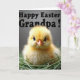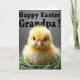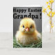 This card features a close-up photo of a fluffy, bright yellow baby bird centered in the foreground, glowing warmly against a softly shaded grey background. The tiny bird’s down looks velvety and lightly lit, with fine strands catching the light like a gentle shimmer. Its dark, bead-like eyes gaze straight ahead with a tender, thoughtful look, as if quietly sharing a moment of closeness with the viewer 🌷. A small, soft orange beak adds a sweet contrast to the sunny feathers without stealing focus. The bird sits nestled in a bed of fresh green, grass-like fronds that curve around it like a protective hug 🐇. Near the top of the design, a short greeting appears in dark lettering, centered and easy to read against the muted background. The green blades frame the lower edge while the yellow fluff stays sharply detailed at the center.