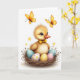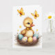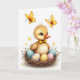 This card shows a fluffy butter-yellow baby bird with a tiny tuft of down and big dark eyes, wearing a small sunny bow tie that adds a sweet, friendly touch. It sits snugly in a woven twig nest, leaning in as if keeping close to the little treasures around it. Tucked beside the bird are pastel eggs in sky blue, soft pink, and warm yellow, each decorated with small stars and dots that feel like quiet little notes of affection. Above the scene, two golden-winged insects drift and circle one another, like gentle companions meeting in midair 🐇. The background stays bright white, making the soft colors stand out while keeping the focus on the bird’s tender expression. A short Easter greeting appears near the top in a light, warm-toned font, leaving plenty of open space around the illustration 🌷. Tiny golden star accents are scattered around the nest and near the insects, catching the light like small specks of shimmer.