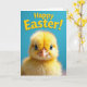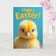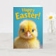 This greeting card features a tiny yellow chick nestled in the lower portion of the design, its soft down lit gently so it looks like it could be nuzzling up to you like a close friend. The background is a smooth, cool sky-blue blur that makes the chick’s round shape and delicate feathers stand out clearly. Its large dark eyes catch small points of light, giving it a tender, curious gaze that feels like a sweet shared moment. A small beak sits neatly in the fluff, adding to the cozy, affectionate look. Near the top, rounded golden lettering displays a short Easter message, centered and easy to read with a faint shadow for depth. A little 🌷 or 🐰 detail can sit nicely alongside the greeting, keeping the spring theme light and friendly. Fine wisps of feathering are visible on the head, with denser down across the chest against the soft blue backdrop.