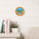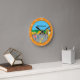 Got a little boy who loves construction vehicles? This custom clock is perfect! The clock has a dump truck, cement truck, and excavator, all working together at a road construction site. A young boy stands near the front with a stop sign to help stop traffic. There are also orange safety traffic cones and background mountains and blue sky. Finish the clock with your young man's first name.