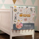 Add a custom touch to the bedroom or nursery of your little boy with this adorable baby blanket. Blanket has a pattern of a train, car, rocket ship, pirate, boat, helicopter, robot, cat, bunny, duck, dinosaur, and more. Add a photo and first name on the bottom blue area for a personalized touch.