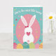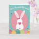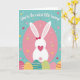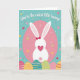 This card features a stylized white bunny centered on the front, with long ears touched with tiny pink dots and a bright red bow tie that suggests a sweet, friendly charm 🐰. A fuchsia heart sits on its chest like a little sign of affection, with a small pink-speckled tail just below. Behind the bunny, a wide soft-pink oval frames the figure against a calm aqua-blue background, giving the scene an airy, gentle setting. Small hearts and floating dots in assorted colors drift around the bunny, like quiet hints of closeness shared in the moment 🌷. Along the bottom edge, a row of decorative eggs stretches across the design, each filled with stripes, dots, and wavy lines in coordinating pastel tones. Near the top, the phrase “You’re the cutest little bunny!” appears in white flowing lettering, centered above the bunny and standing out clearly against the blue. The eggs show sunny yellows, soft greens, teals, and pinks, with each pattern outlined neatly for a tidy, detailed finish.