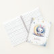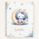 Super cute notebook featuring cute white little bunny wearing a beautiful blue bow sitting on a lovely moon with some gold falling stars and some dusty blue clouds.