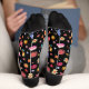 This fun Halloween socks are bright and colorful. The small print is crisp and shows the fun details. The softness of the socks feels nice on my feet and ankles. .