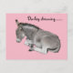 Cute little grey donkey baby foal lying down sleeping on a pink background. Text reads 'Donkey dreaming...' The donkey foal was photographed in the New Forest national park in England.