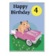 This unusual editable girls greeting card shows a cute hamster driving a pink car with the caption “ Happy Birthday” and the age 4