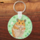 This keychain features a cute Golden Hamster, plump, furry, and holding a flower in it's hands against a green floral patterned background. Ideal to keep your keys safe, a colourful accessory, and a great gift for Hamster enthusiasts of all ages,
